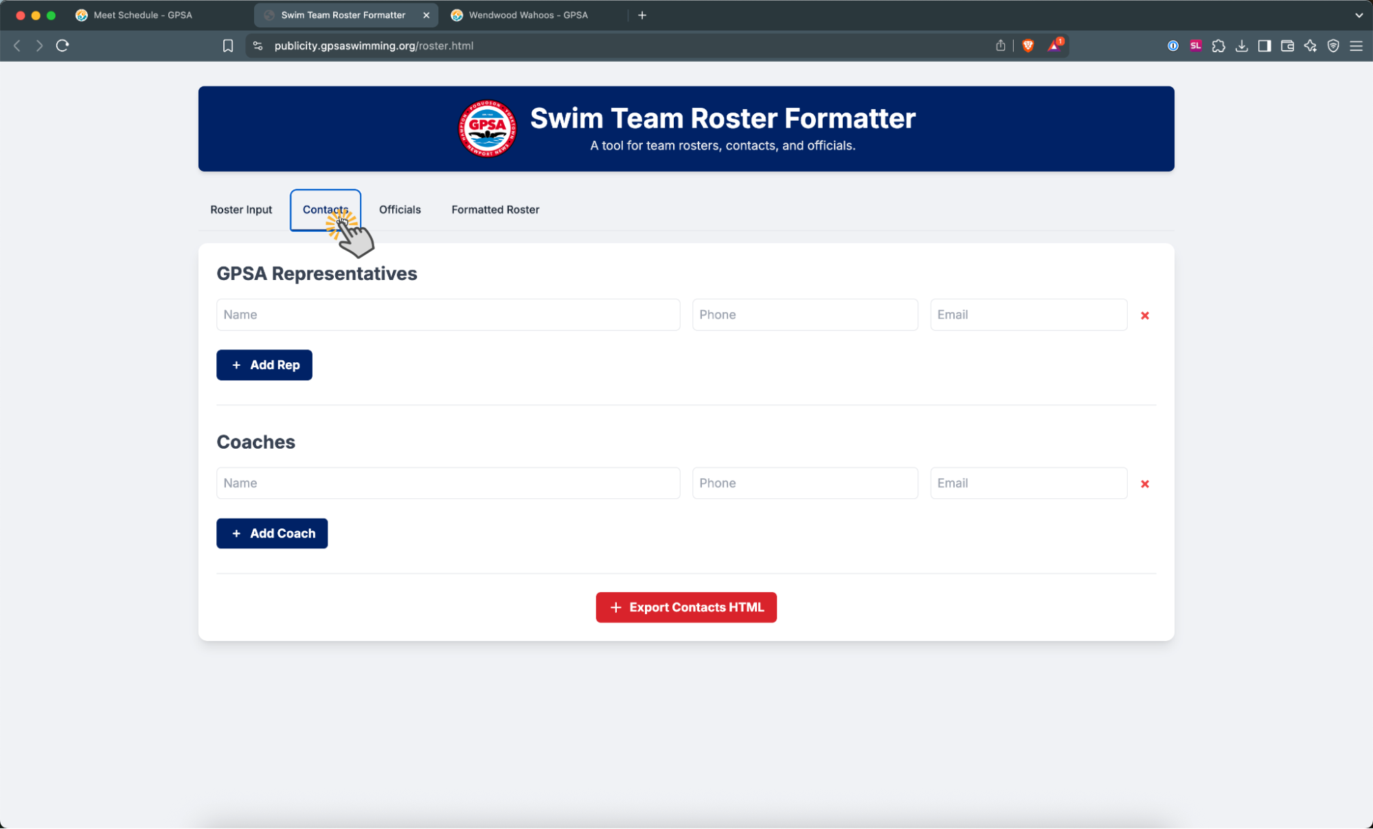 1. Select the Contacts tab of the Swim Team Roster Formatter