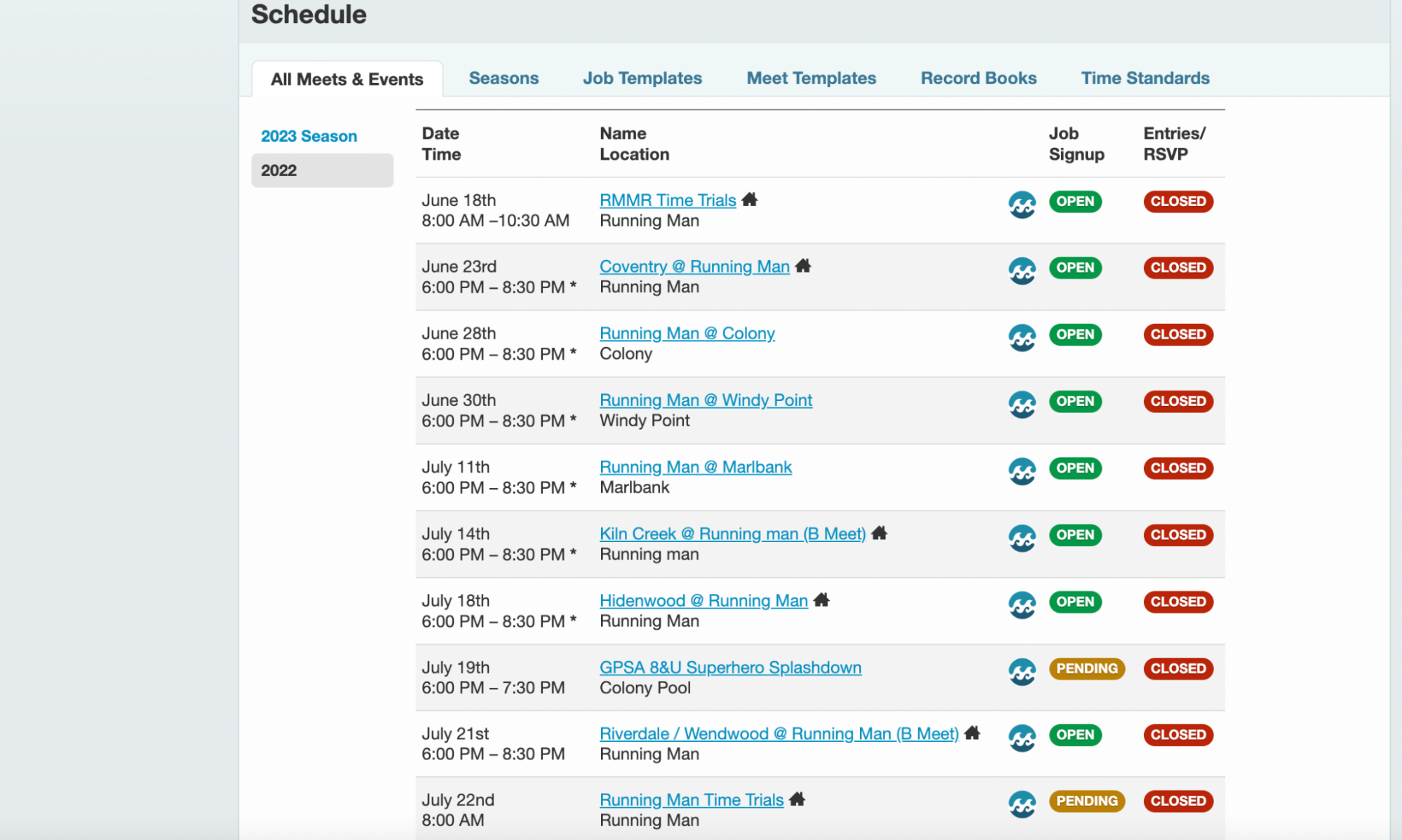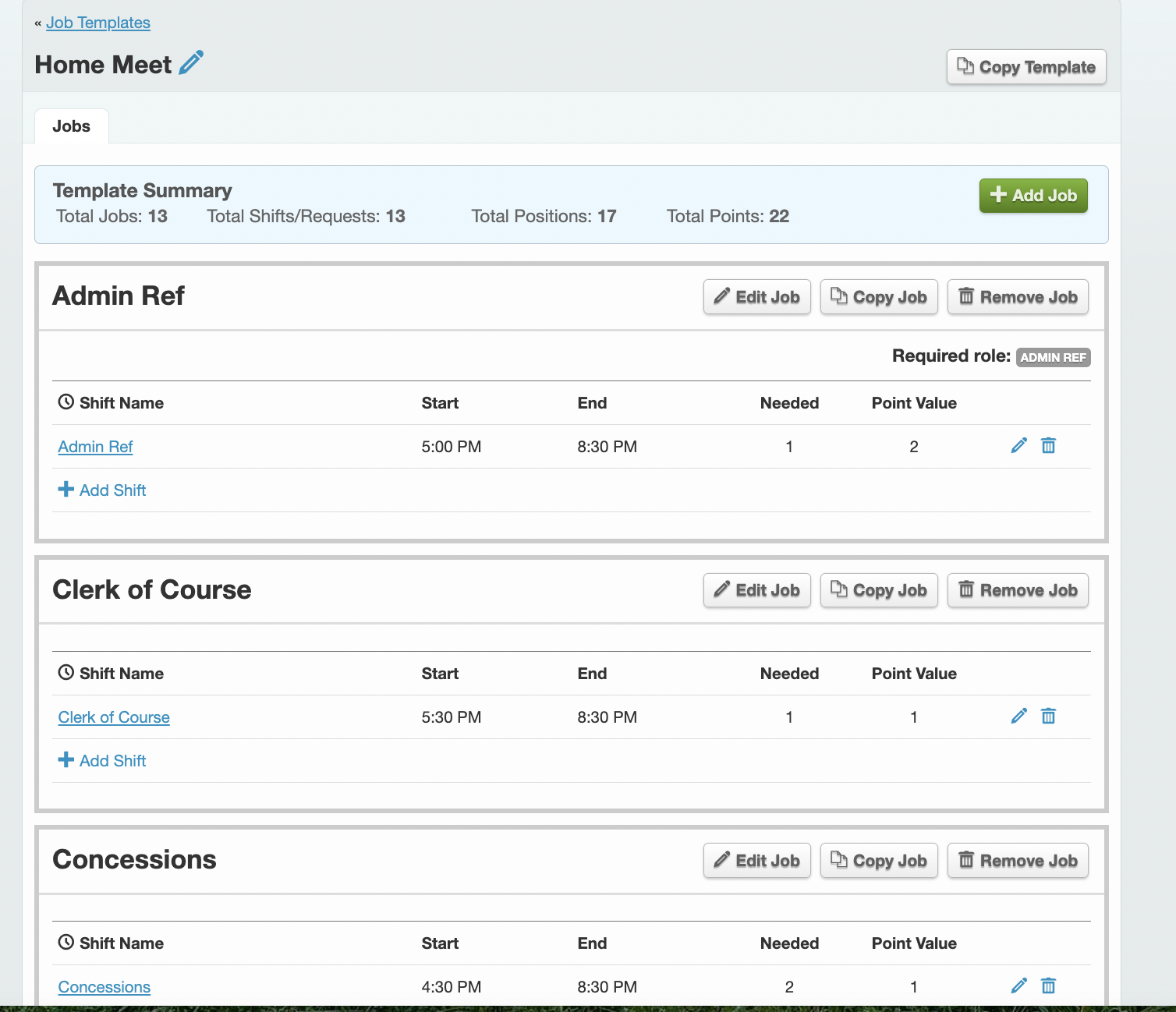 Job templates define volunteer roles needed for home and away meets.