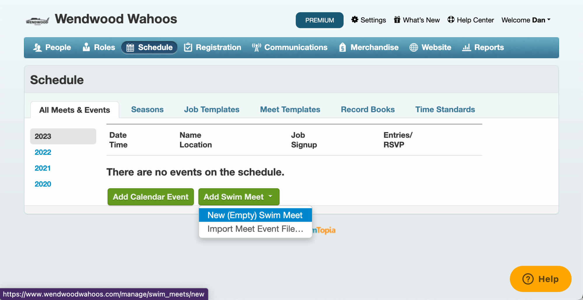 On the Schedule screen select Add Swim Meet and then New (Empty) Swim Meet